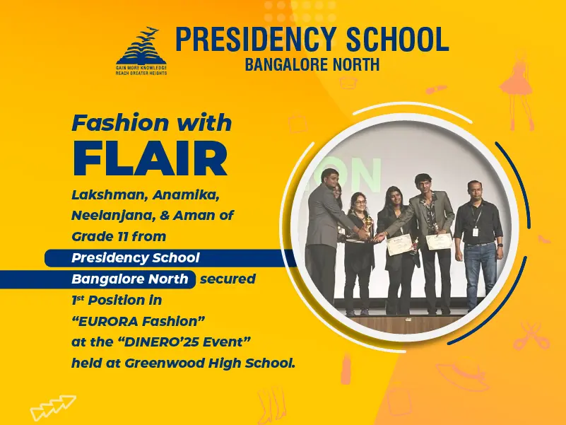 Lakshman, Anamika, Neelanjana, and Aman of Grade 11 from Presidency School Bangalore North secured 1st Position in “EURORA Fashion” at the DINERO’25 Event hosted by Greenwood High School. Their creativity, confidence, and style lit up the stage — a proud moment celebrating innovation and artistry in motion!