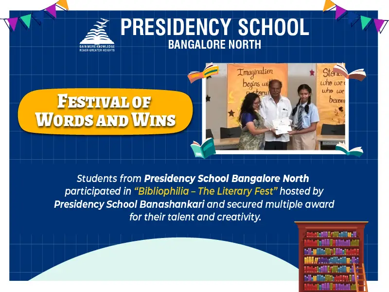 Students from Presidency School Bangalore North participated in “Bibliophilia – The Literary Fest” hosted by Presidency School Banashankari and secured multiple awards for their remarkable talent, creativity, and literary flair.