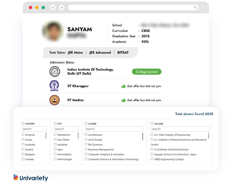 Right from entrance exams taken to colleges applied and admitted to, students can view their alumni journeys. The unique platform enables students to filter by interest and view thousands of alumni profiles.
